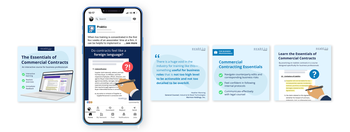 In order to learn and iterate as quickly as possible, I ran a tight ad test on LinkedIn, targeting junior to mid-level contract management roles. I advertised the flagship product, an on-demand commercial contracting course, and sent traffic to a landing page I created specifically to promote the course.